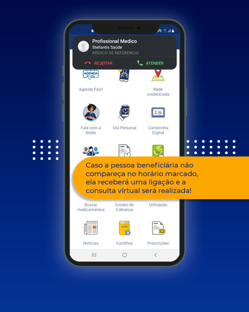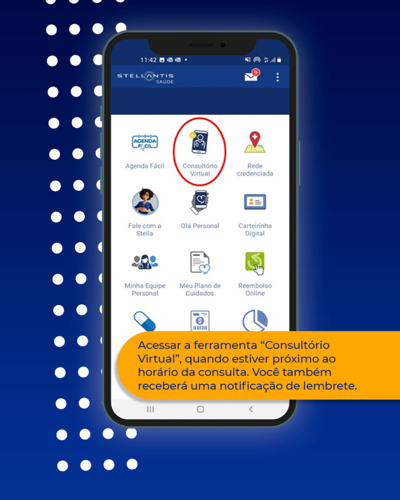 No aplicativo Stellantis Saúde, basta acessar a função “Consultório Virtual” no dia e horário marcados para ter o atendimento online