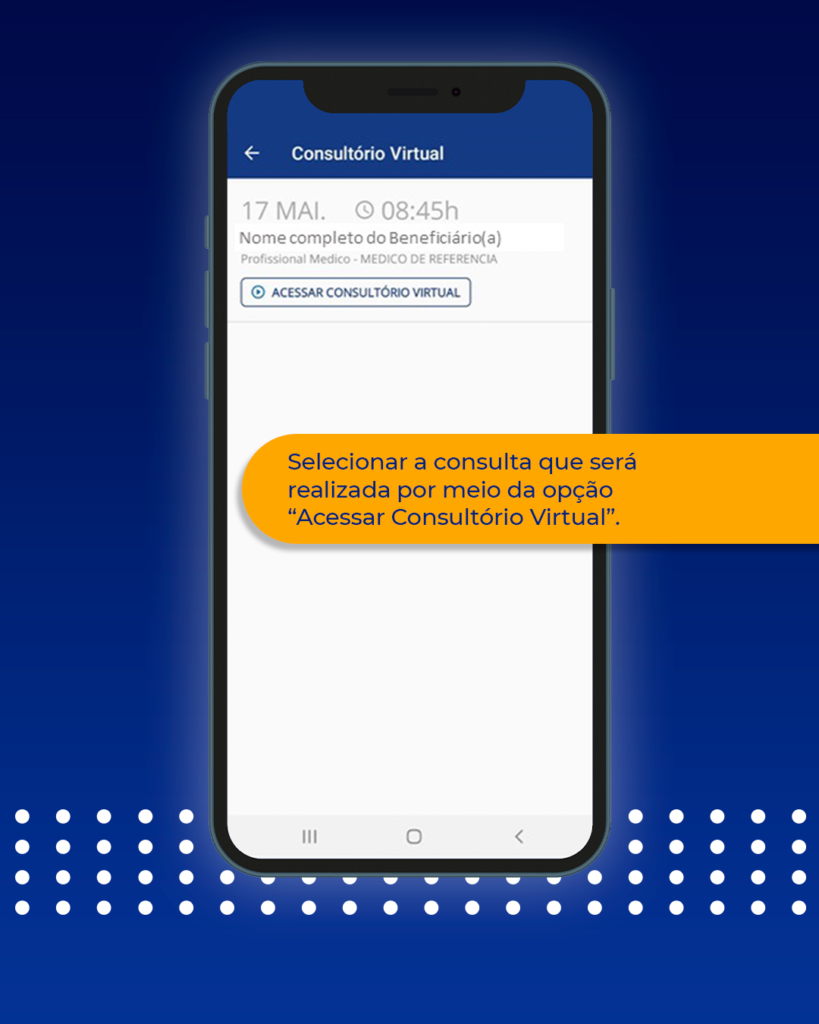 Para acessar o Consultório Virtual, o beneficiário ou beneficiária deve acessar o aplicativo com o login da pessoa que será atendida ou, em caso de dependentes menores de 18 anos, poderão acessar pelo login da pessoa que agendou a consulta. Em seguida, basta seguir o passo a passo.