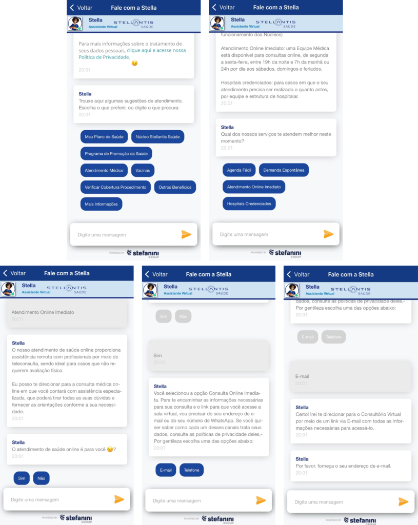 Faça o login no aplicativo Stellantis Saúde e clique na opção “Fale com a Stella”, seguindo o passo a passo da imagem abaixo: